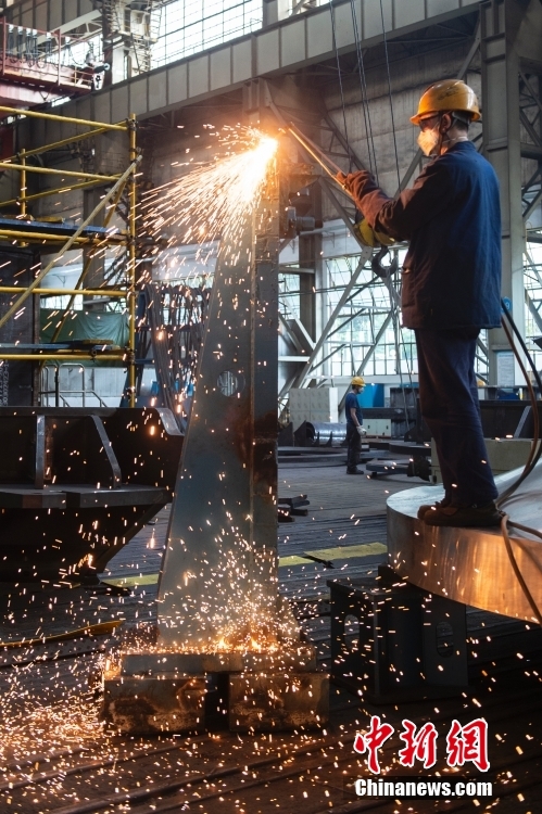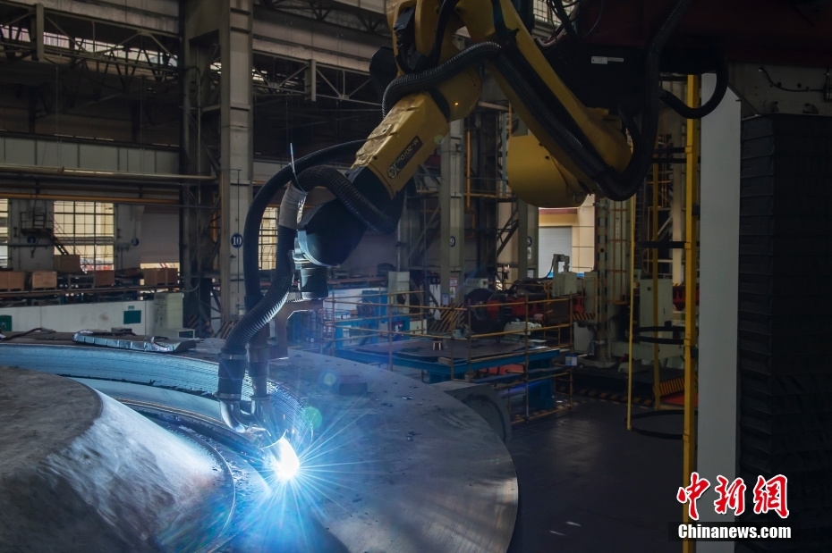 目前,车间已经建成集重型机加控制、数字化装配、机器人焊接等为一体的新一代清洁能源装备重型制造车间。图为车间里的机器人焊接作业。
